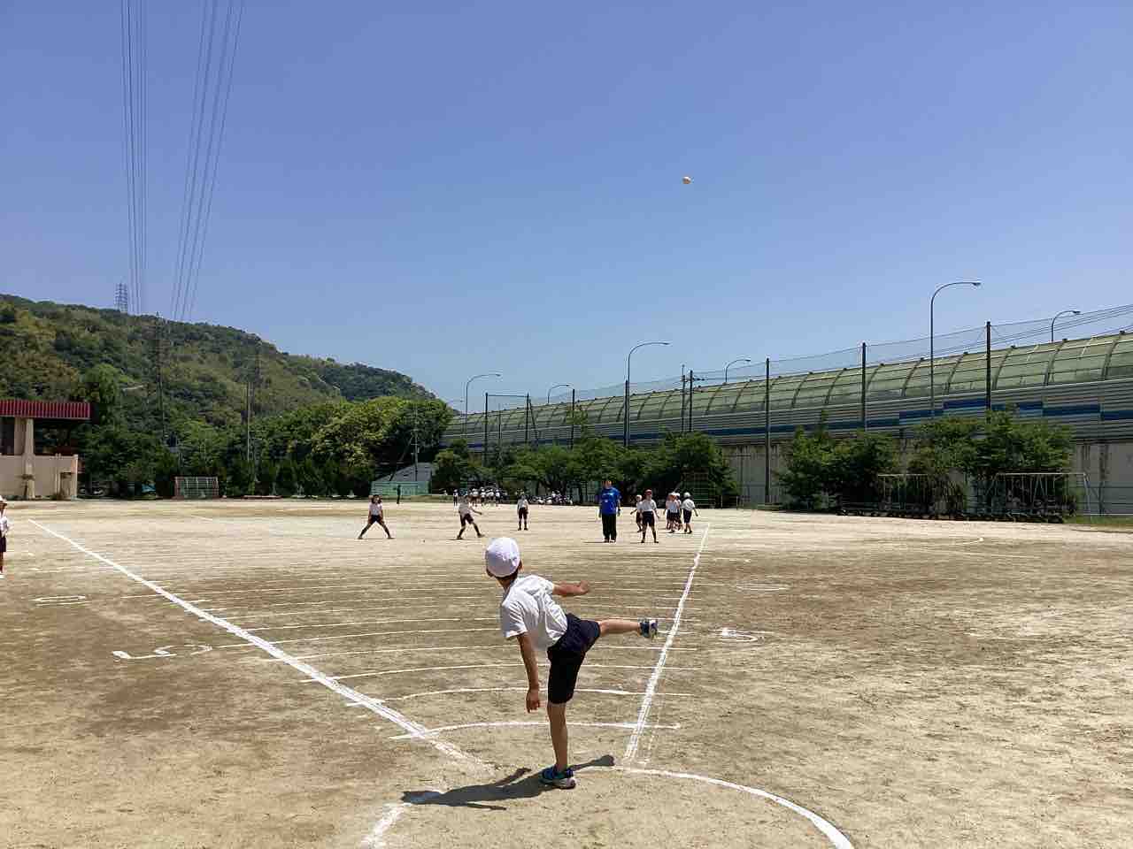 屋外は、ソフトボール投げ。力いっぱいボールを投げます。