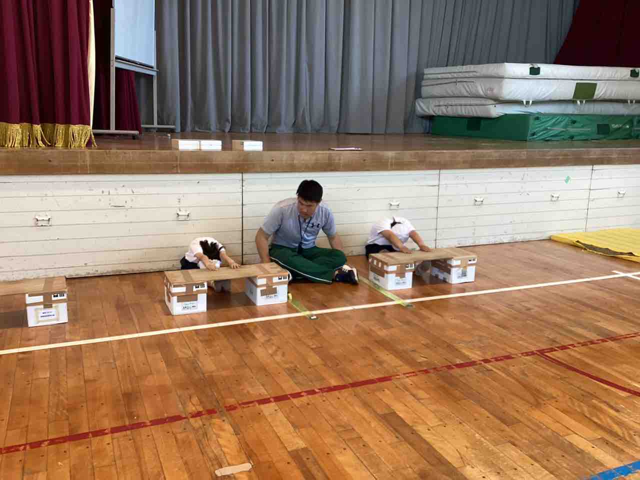 足を伸ばして座り、背中を壁面につけた状態で測定器(段ボール)を両親指の腹で押し、測定器の移動距離を測る種目です。体の柔軟性を測定します。