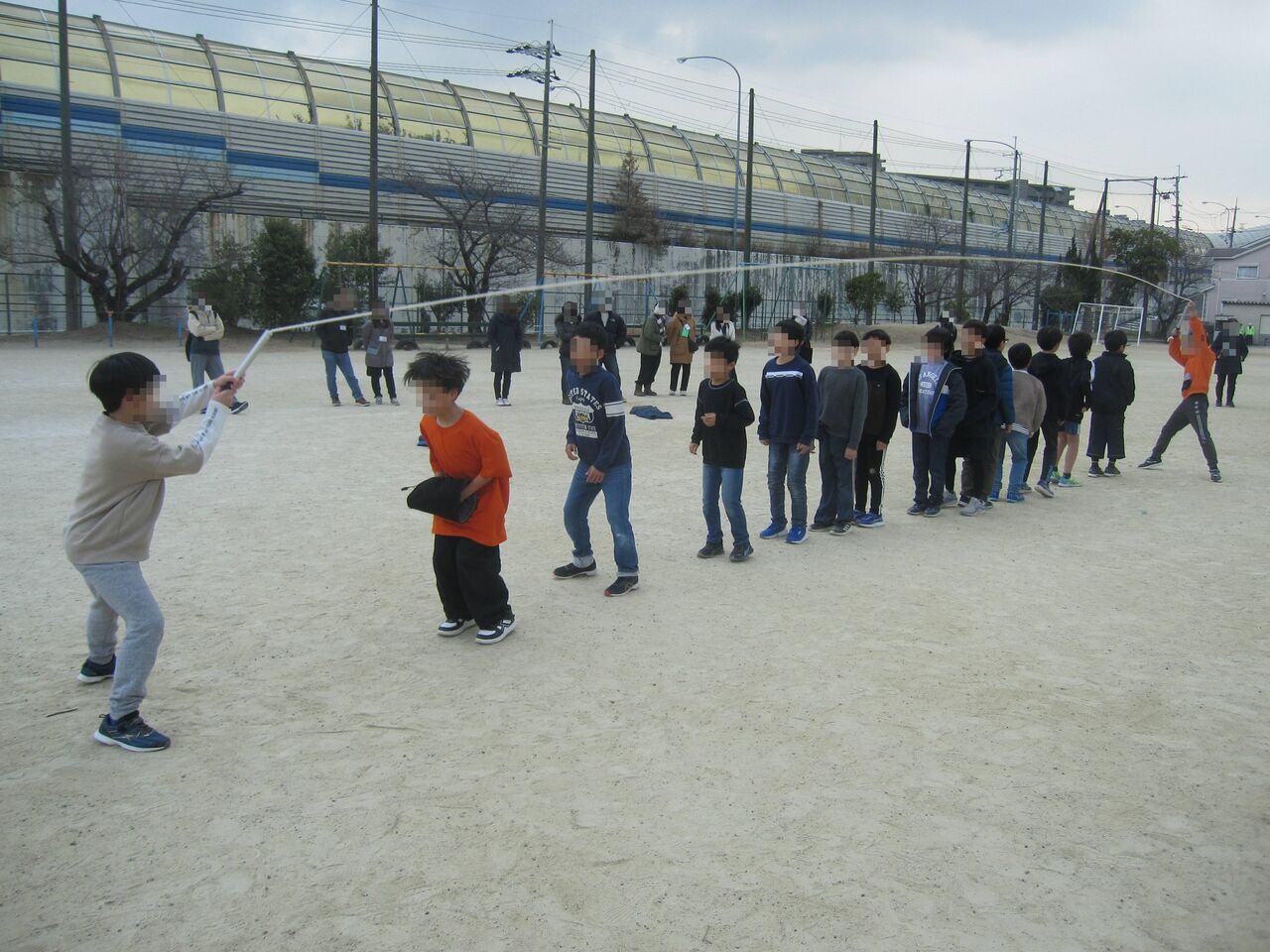 各クラスに分かれて大縄跳びをしました。途中からは保護者の方にも参加していただき、子どもも大人も協力して跳んでいました。